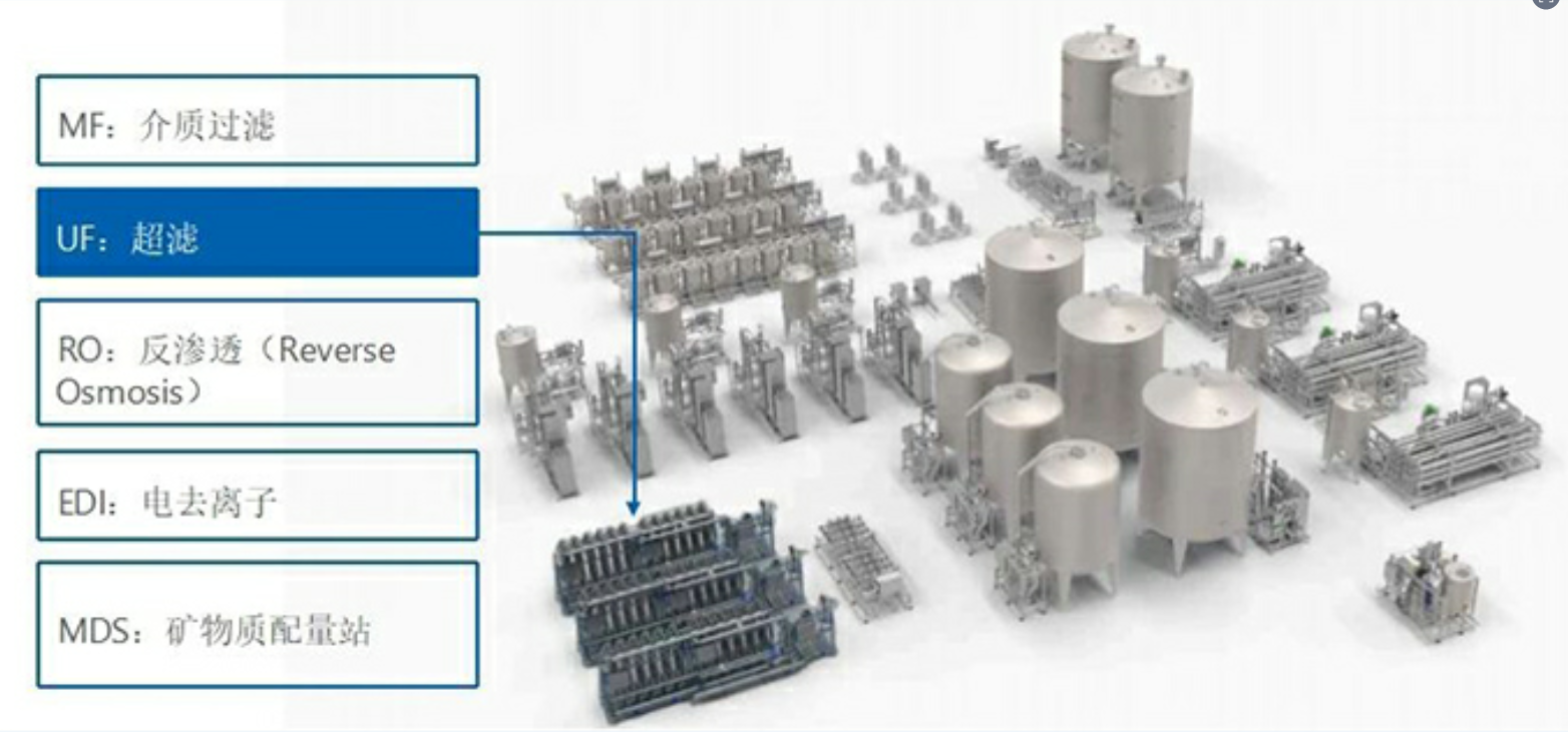 UF (超濾膜過濾):對水在流入流出運行中使用中空纖維隔膜技術進行超濾。去除有機物、膠體、染料和微生物。