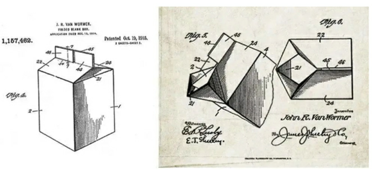 1911年,約翰將牛奶紙盒設計為只需單張紙板通過折疊、拼貼和加封嘴即可完成包裝。成為了屋頂盒的雛形。